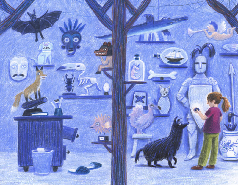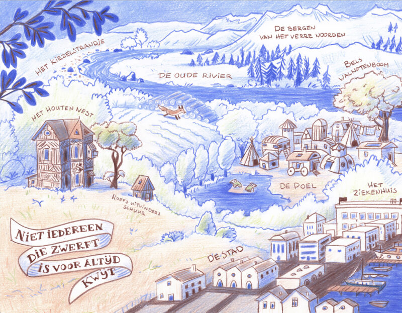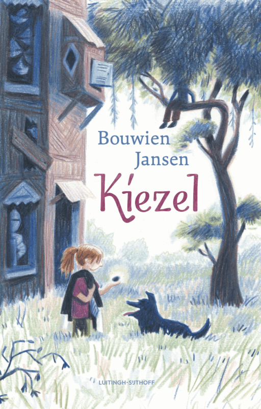 Voor het boek ‘Kiezel’ van Bouwien Jansen maakte ik dit omslag en deze twee gekleurde schutbladen. Gewoon met mijn kleurpotloodjes. Het is een fijn en fantasievol boek geworden.